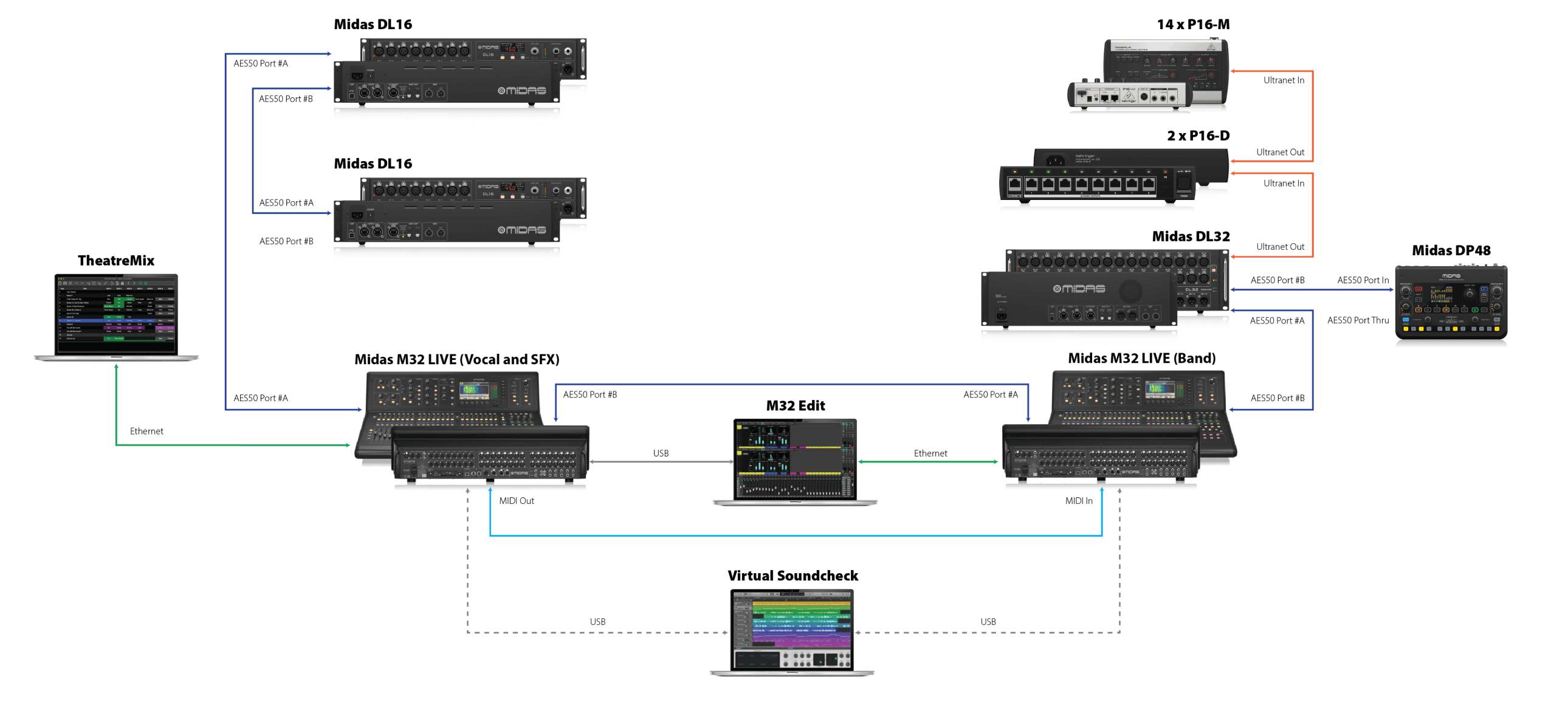The system was built around two Midas M32 LIVE mixers, with one controlling the vocals and the other handling the band. Both the clock and channels were synchronized via AES50, allowing shared busses and seamless communication between the two mixers.